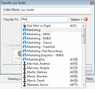 Requirements: Access Control Rights determine which Attendant Profiles, User Queues, Workgroup Queues and Station Queues are available as transfer targets. By default, the Transfer dialog box searches the Company Directory, and the appropriate Attendant Profiles, User Queues, Workgroup Queues, and Station Queues for matching names and numbers.
