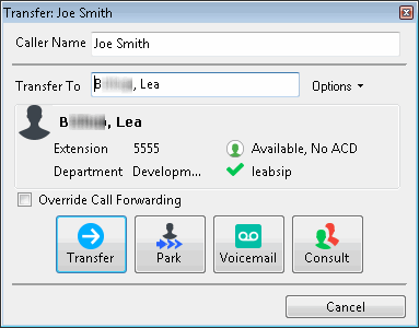 CIC client users can set Call Coverage options that forward their calls to another CIC user. CIC client users can also set status details that forward their calls to an alternate phone number. Select the Override Call Forwarding check box to ignore these settings and transfer the current call directly to the selected number or voice mail box or to park the call on the selected number.