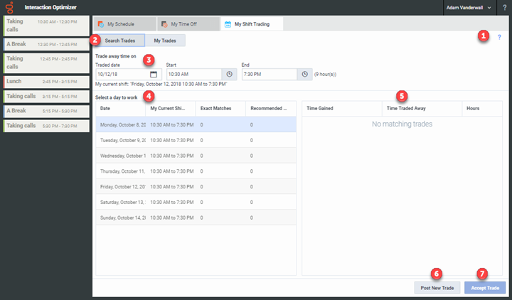 Use this view to manage your shift trade requests. You can edit or cancel any of your unmatched trade requests or your matched trade requests that are still pending approval.