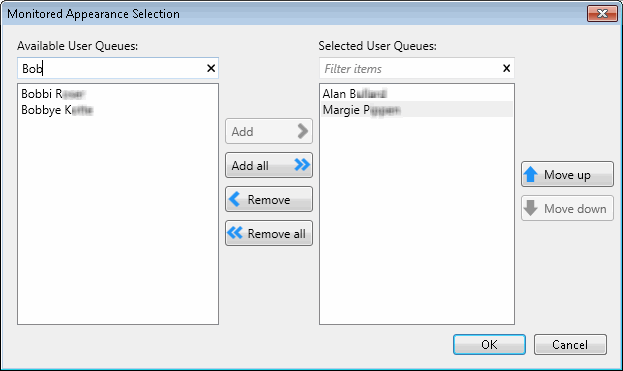 When the Selected User Queues list contains the names of the user queues you want to monitor, click OK.
