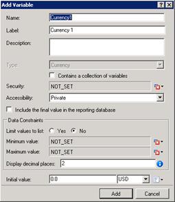For a state or task, right-click in the blank area of the Variables tab, point to Add, and then click Currency. IPA Designer displays the Add Variable dialog box (see figure).
