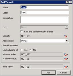 Note: If you limit the variable's values to a list, you cannot set minimum or maximum values for the variable. In addition, you must set an initial value that appears in the list. When you select the Yes radio button for limiting the values to a list, IPA Designer automatically changes the Initial Value text box to a drop-down list and fills in the suggested initial value.