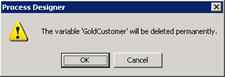 Note: If you delete a variable from a work item and then add a variable with the same name but a different variable type, it will cause an error in your process.