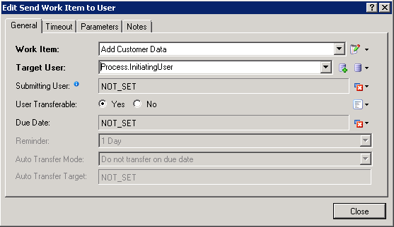 To prevent the target user from transferring the work item, select the No radio button for User Transferable. The Yes button is selected by default.