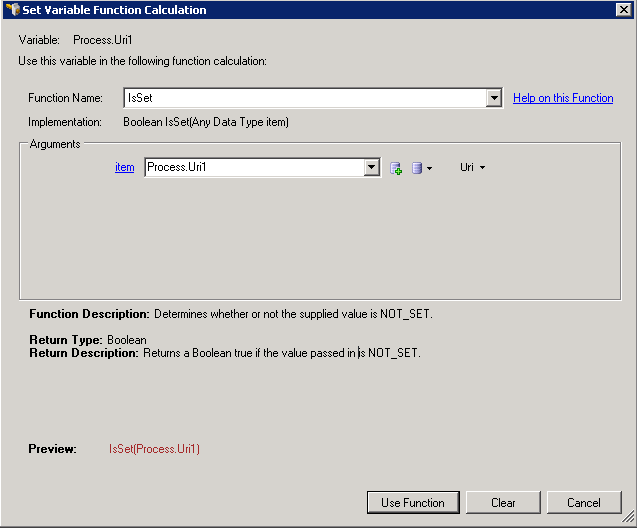 Use the Set Variable Function Calculation dialog box to set up a function that returns a value to use in a Calculation Editor comparison. To display this dialog, click the Function link in the Comparison Item dialog box.