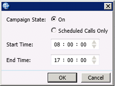Select a Campaign State for this schedule to use. To place regular and scheduled calls, select On. To place only Scheduled Calls when this schedule is active, select Scheduled Calls Only.
