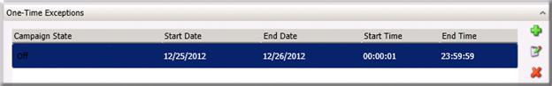 For the entry, you must set campaign state, start date, end date, start time and end time. Campaign State can be On, Off, or Scheduled Calls Only. Most often, you will select Off to prevent dialing when a schedule exception is in effect.