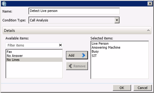 Call Analysis is a CIC process that analyzes a connection to determine if the call reached a live person, a fax machine, or an answering machine, and whether or not an agent is available to process the call. Call Analysis can be activated at the campaign level (see Call Analysis setting) or at the policy level (see Call Analysis Behavior type).