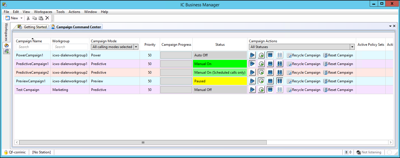 The Campaign Command Center view displays a list of all your campaigns and their status. It allows an administrator to filter and sort the campaigns displayed in the view, alter the campaign's priority, as well as the ability to change a campaign's status. To make this possible, the Campaign Command Center view employs a number of features.