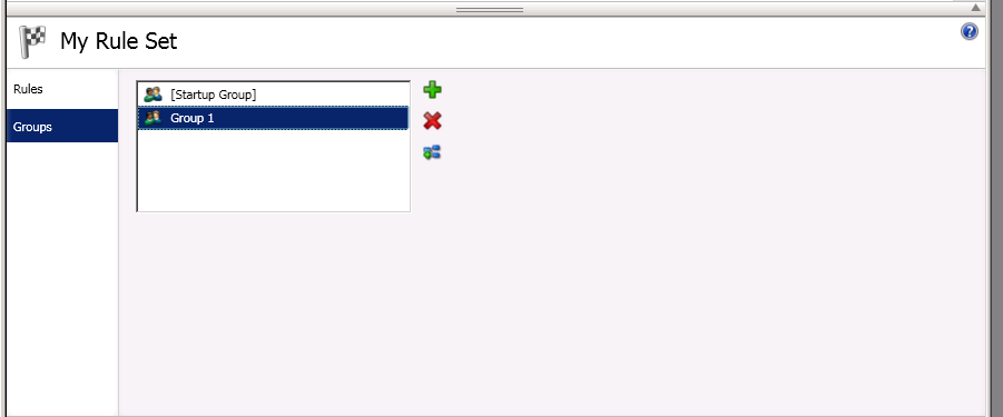 In the middle panel of the Rule Sets View, you can use the controls on the Groups tab to create new rule groups as well as view or modify existing groups. Once you create a group, you can associate it with individual rules using controls on the Rules expander. Rule Groups make it possible for an action to activate selected rules in a Rule Set at once. Each set of Rule Groups is visible to the current Rule Set only.