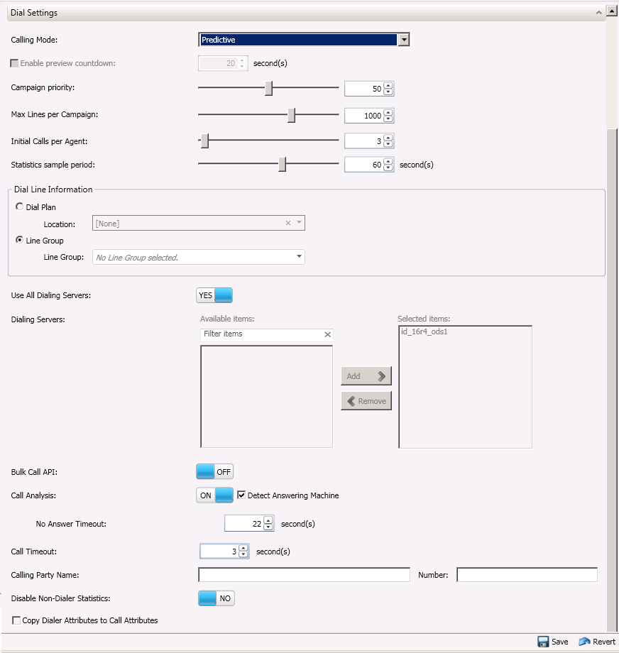 Options on the Dial Settings section set the campaign's dialing mode, dialing servers, call analysis options, and whether to adhere strictly to CIC's Dial Plan or use one specific line group for campaign calls.