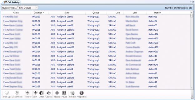 The Call Activity view displays activity in all line or station queues that the user has ACL rights to see. Disconnected interactions are immediately removed. Each row in this view displays a configurable set of queue columns.