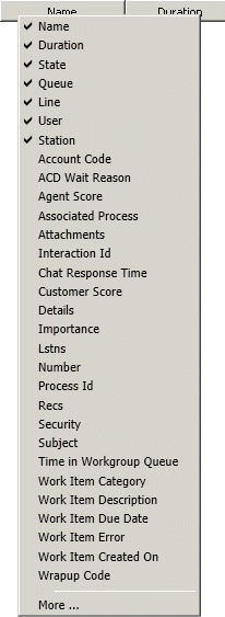 To change the selection of queue columns displayed, right-click any column heading. This opens a shortcut menu that lists frequently-used columns. Checkboxes indicate whether a column is currently displayed in the view.