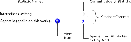 Suppose that two alert conditions have been set for Agents logged in on this workgroup. The first triggers when the value is less than 3. The second triggers the alert when the value is between 0 and 7. Since both conditions are true, the statistic control displays icons for both. As you can see, an active alert is indicated by a color coded severity icon, and custom text attributes. Both of these properties are specified when alert are set.