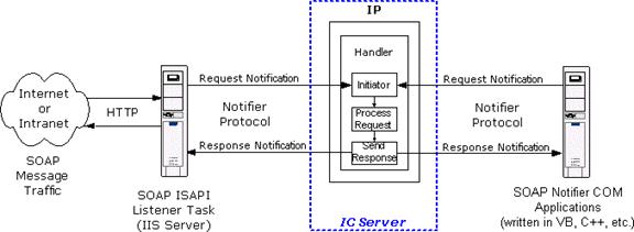 For the purpose of the IC SOAP implementation, message transport is not limited to any kind of protocol. SOAP requests are sent as notifications containing payload data as well as transport-specific out-of-band information. As HTTP is most frequently used as transport for SOAP requests through the internet, an ISAPI listener is provided. However, any kind of client who "talks" Notifier could issue SOAP requests. For example, a SOAP Notifier COM object can directly send SOAP packets to IC.