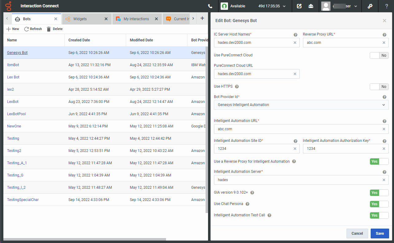 Note: You should logout and login back to Interaction Connect to see newly added Bot configurations in the Channel configurations form.