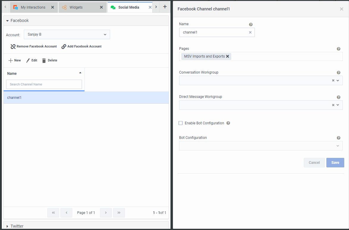 Result: The new Facebook Channel name appears in the Social Media view.