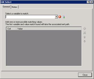 Note: One important difference between the Decision and Select actions is that a Decision action can make your process branch if a value is in a given range. On the other hand, the Select action requires specific values and cannot work with ranges of values. For example, you could tell a Decision action to do something if a person's credit score was above 700. With a Select action, however, you would need to give the action specific values for each case: do one thing if a person's credit score is 701, another if a person's credit score is 557, and so forth. Therefore, if you need to make a state branch based on ranges of values, you are better off using a Decision action.