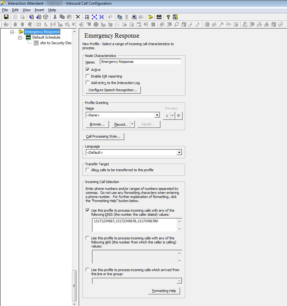 First, Open Interaction Attendant and create a new Profile. In this example, the profile is named Emergency Response. Ensure there is no greeting. Then, within the "Incoming Call Selection" section, check the DNIS checkbox. Then enter the 11 digit phone numbers in a comma separated list. Telephone numbers must be entered without formatting, and may contain wildcards. See formatting help.