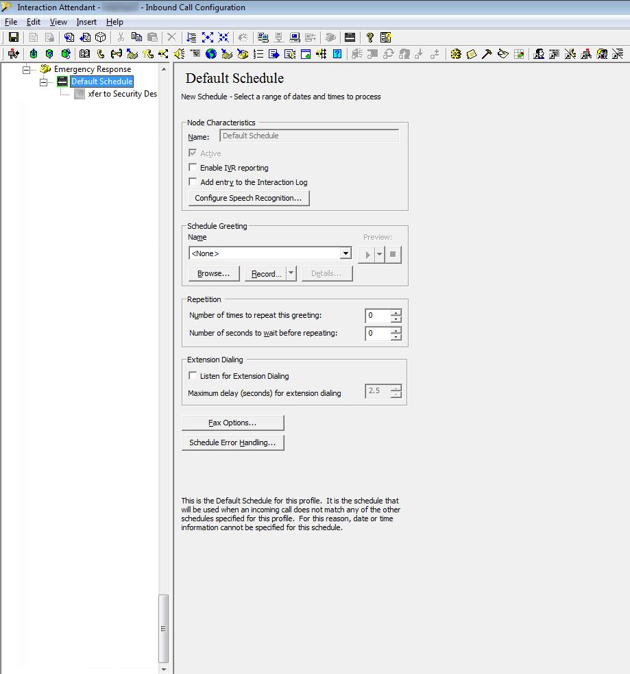 Next select the Default Schedule and ensure there is no greeting, repetition settings are set to zero, Listen for extension dialing is unchecked. Click on Fax options and remove the Fax Listener checkbox. This ensures the call immediate proceeds to the workgroup transfer without delay.