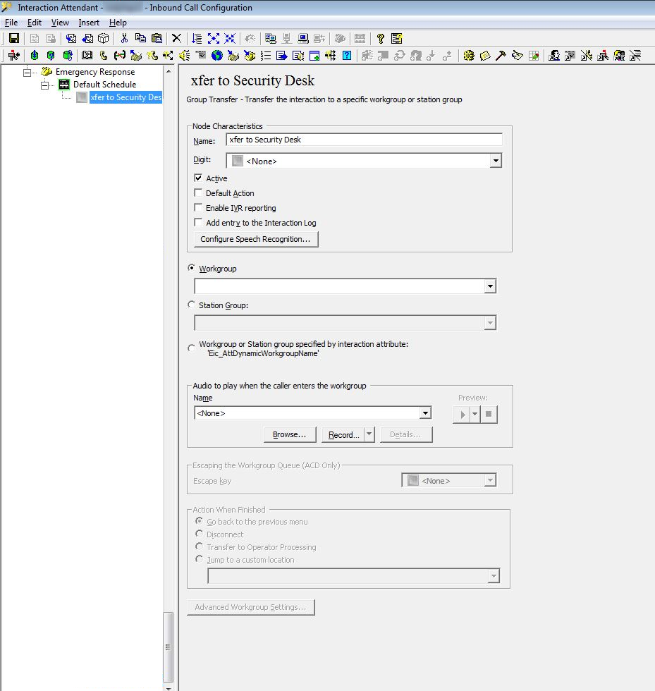 Lastly, while the default Schedule is selected, add a Workgroup Transfer node. In this example, the node is named "xfer to Security Desk". Select Workgroup and then in the drop down menu select the appropriate workgroup that should receive these calls.