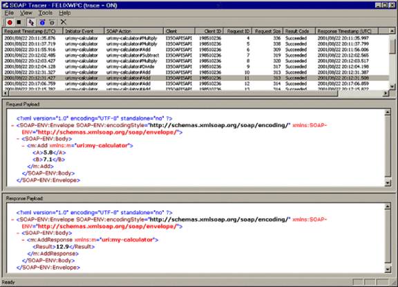 The SOAP Tracer window is divided into three panes. Users select a message in the top pane to display corresponding request and response messages in the other panes.