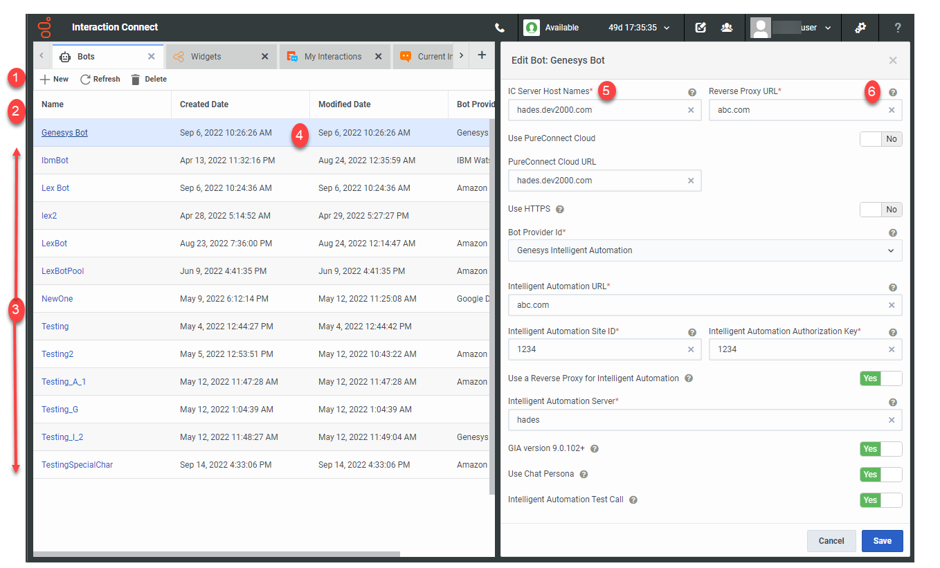 New (Add), Refresh, and Delete controls. To update the Bots and display any new Bot configurations created by other Interaction Connect users, click Refresh Note: The Bots view does not update automatically. |