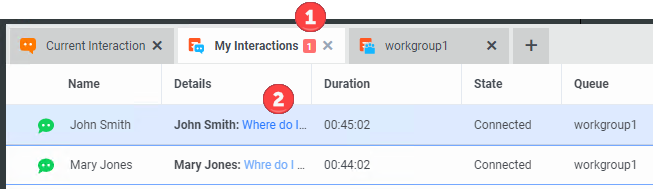 When both the Current Interaction and My Interaction view are not visible at the same time, a message indicator appears on the view tab. This alerts you that a chat conversation requires attention. |