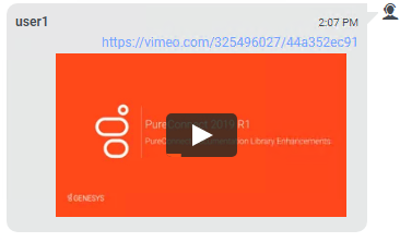 The conversation area displays the pre-configured automatic messages that CIC sends when the chat begins, plus all the chat messages from all the participants. Your replies have a gray background. An icon with a headset indicates a PureConnect user. Icons without headsets indicate customers or other external chat participants. |