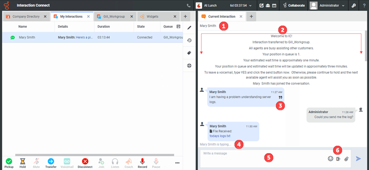 The Current Interaction view displays a Chat conversation. You can use the Current Interaction view to review the conversation and send text to the other chat participants.