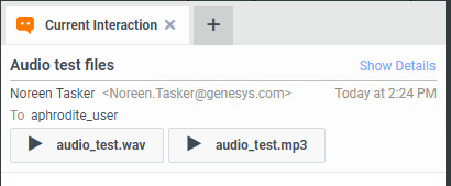 Any files attached to the email interaction appear here. Depending on the browser you use, you can click on the attachment to download, open, or save the file. Note: If your browser supports playing a particular type of audio file, a Play button appears in place of the file type icon. Click Play to play the complete audio file. During playback, a Stop button replaces the Play button.