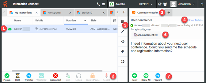 To display or preview an ACD-routed email interaction, select it in My Interactions. Click Pickup to accept the email interaction. Note: An Email configuration option controls whether inline images and other linked content appear in incoming email messages. |