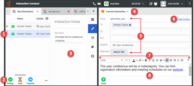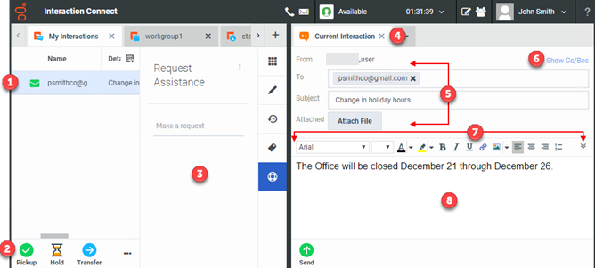 Your currently selected email interaction appears in the Current Interaction view. Use this view to preview the content of an incoming interaction without picking it up. You also compose email messages or replies to email interactions in this view.
