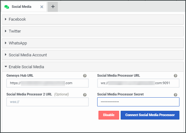 In the remaining two fields, enter the required information, then click Connect Social Media Processor.