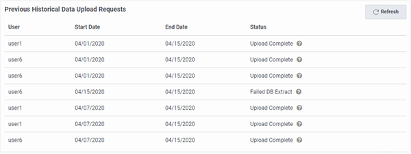 The status of your upload request appears in the Previous Historical Data Upload Requests section.