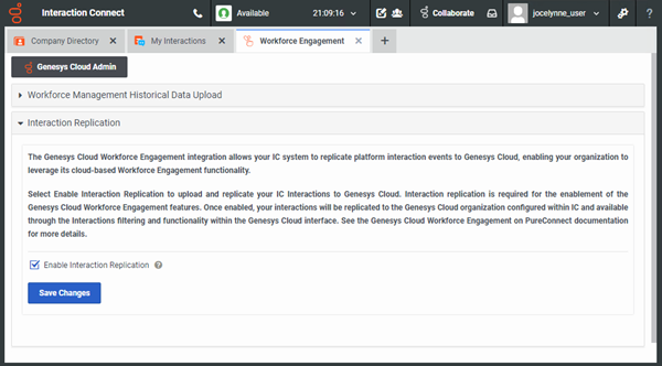 Note: You can disable interaction replication at any time by clearing the Enable Interaction Replication check box and clicking Save Changes. This may result in gaps or missing data in your Workforce Management data within Genesys Cloud. Consider this carefully before turning off replication.