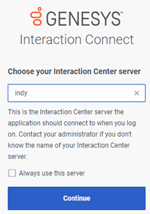 Tip: If your CIC administrator has enabled Single Sign On and you select the Always use this server check box, you log back in automatically anytime you don't log off Interaction Connect but just close and reopen your browser.