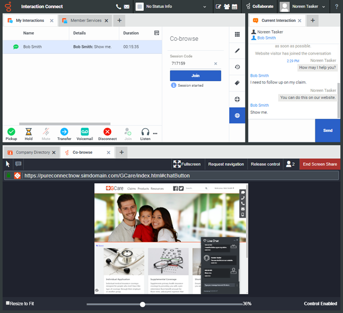 Select an interaction and enter a Session Code in the Co-Browse sidebar. After you click Join, you see the website visitor's view of your company's webpage.