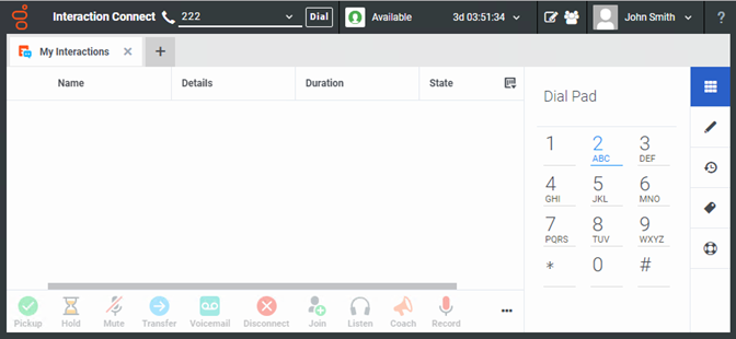 The My Interactions Sidebar enables you to display the Dial Pad, Interaction Notes, or Interaction Log. You can also assign Account and Wrap-Up Codes to interactions and Request Assistance from your supervisor. To choose what appears in the Sidebar, click the appropriate control on the right edge of the sidebar area.