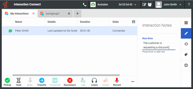 Select a connected interaction and make notes in the Interaction Notes sidebar. To add a note to the interaction, press Enter.