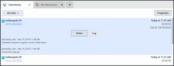 In Call History, select an interaction and click the Properties button. To select which interaction properties to display, click Notes or Log.