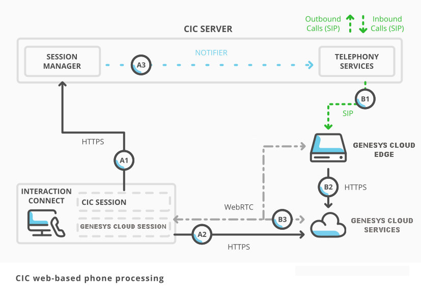 The following diagram and table explain how CIC supports WebRTC communications for the web-based phone feature, including network protocols and sequence.
