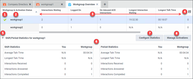 You can view statistics for selected workgroup queues. You can select multiple workgroups and view up to eight statistics per workgroup. Shift/Period statistics can help you monitor your performance and compare it to that of a selected workgroup. With the appropriate license, you can select which Shift/Period statistics you want to view and also enable alerts for the statistics.