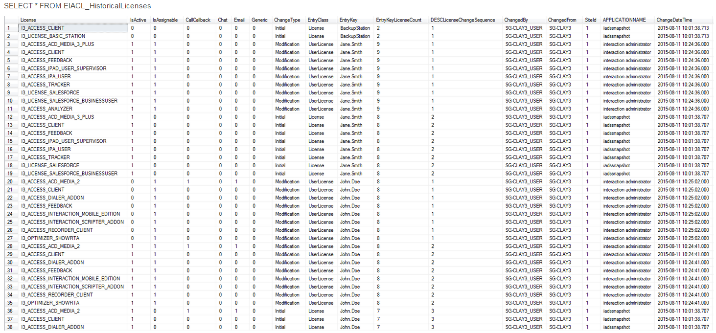 When a user or station is deleted, the most recent entry for that entry key shows a - in the license column and a 1 in the DescLicenseChangeSequence column. This provides an easy way to tell which licenses were allocated to the user or station when the user or station was deleted, in case you need to recreate the user or station later with the same licenses.