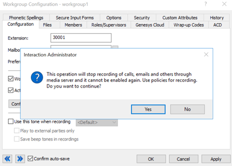 But when they try to uncheck this option, it will be prompted with a message “This operation will stop recording of calls, emails and others through media server and it cannot be enabled again. Use policies for recording”.