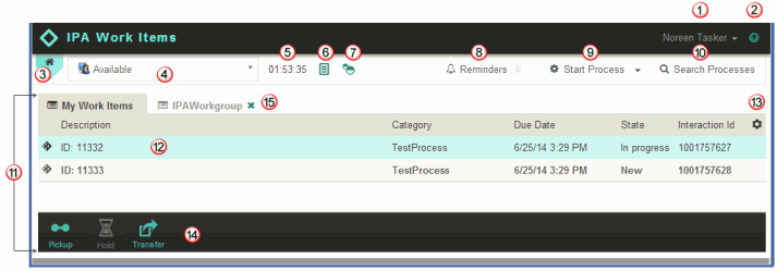 You manage work items and start processes in IPA Work Item client using the various elements of its interface. You can change your Customer Interaction Center (CIC) status or manage your workgroup activation status. You can also add, arrange, and customize workgroup queue views.