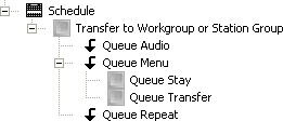 Queue operations are disabled until a Group Transfer node is configured to transfer the call to an ACD (or custom) workgroup. Queue Stay and Queue Transfer are disabled until a Queue Menu node is selected. The figure below illustrates these relationships: