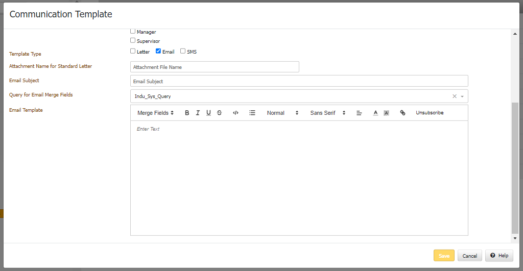 Communication Templates Add/Edit dialog for Email and SMS now has a new Query Name drop down that can be used to populate additional fields in the Merge Fields drop down.