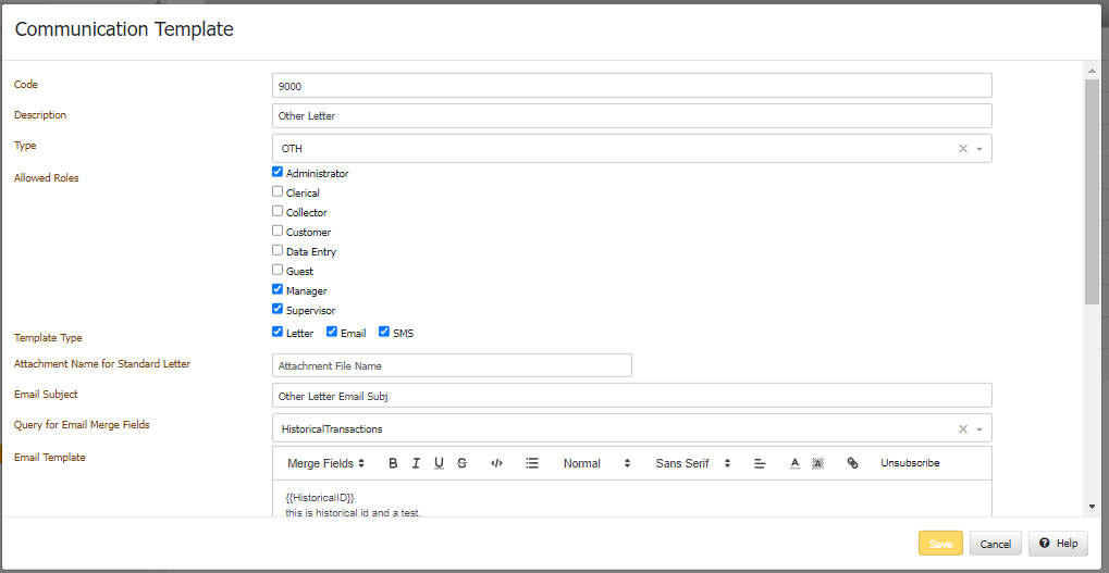 A New letter configuration called Communication Templates has been created to configure if a letter code can be sent has Letter, Email, SMS. Different templates can be set for Letter, Email and SMS and all the templates support mail merge functionality.